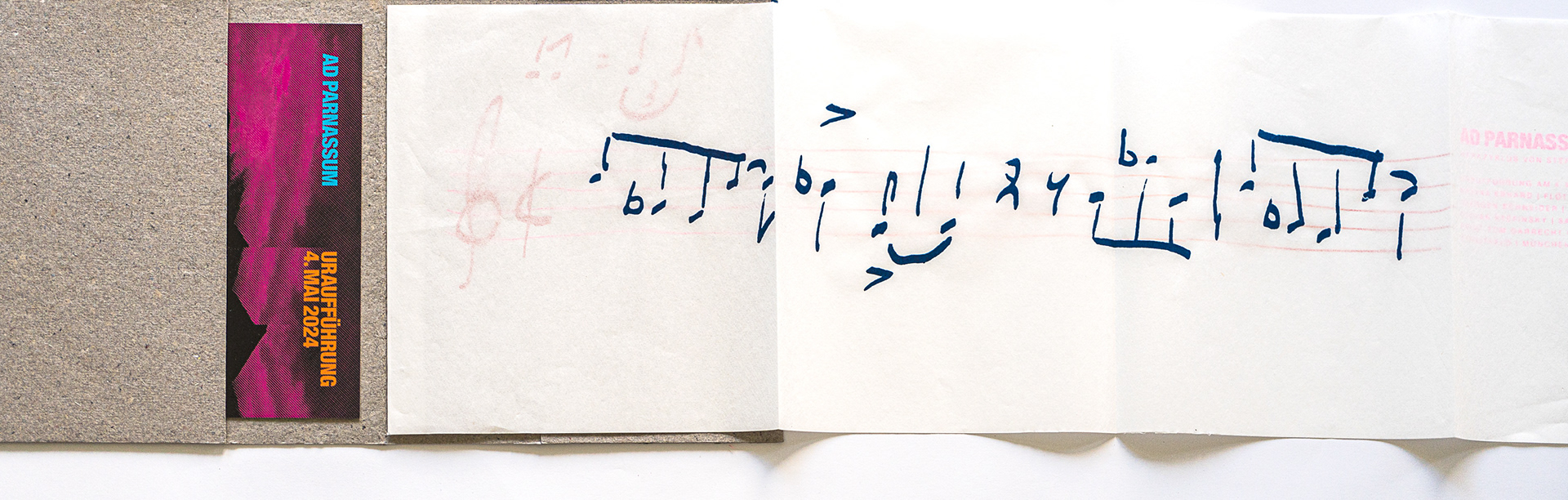 Anlässlich der Uraufführung von »AD PARNASSUM« erscheint die gleichnamige vierfarbige Serigraphie von Tom Garrecht mit einem Fragment der Partitur gedruckt auf Karton und Japanpapier, als Künstler-Edition Rot oder Blau mit jeweils 9 Stück.